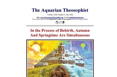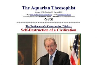This is the Aquarian Theosophist for August. Page one brings the article “Self-Destruction of a Civilization”, whose its f…